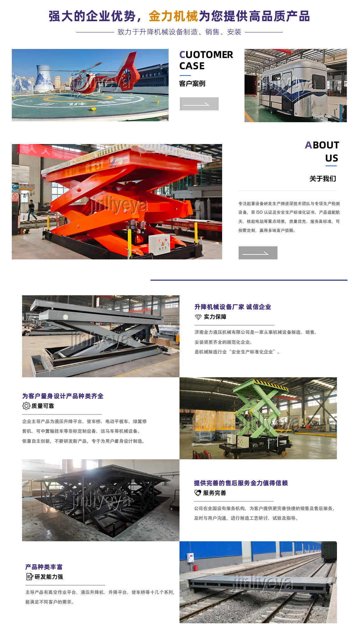 济南金力液压机械有限公司是质量、信誉双保单位,重合同守信用单位。于2004年改制,占地面积12万平方米,建筑面积8万平方米,本公司生产设备精良,检测手段齐全,技术力量丰富,是国内液压升降平台生产厂家。 本公司已通过了ISO国际质量管理体系认证,获得国家安全生产标准化证书。液压升降平台生产设备精良,检测工具齐全,具有较强生产能力,不断研发新产品,坚持诚信为本 、信誉至上的信念和优zhi的服务标准赢得了广大用户的信赖,连续给中国航天科技集团、航空工业、航星设计院、机场、电厂等国家重点单位做配套设备。 公司重视知识产权的保护和自主创新,不断提高研发能力。申报国家发明zhuanli四项:电动旋转垂直升降式立体车库、一种操作面积可变的升降平台、一种抗爆容器支撑调节平台、一种挂车;实用技术zhuanli若干项包括:车载式绿篱修剪机、快速伸缩式铁路跨桥、升降平台安全稳定装置、低压轨道供电电动平车、双速电机电动平车、机车分离式快速...
